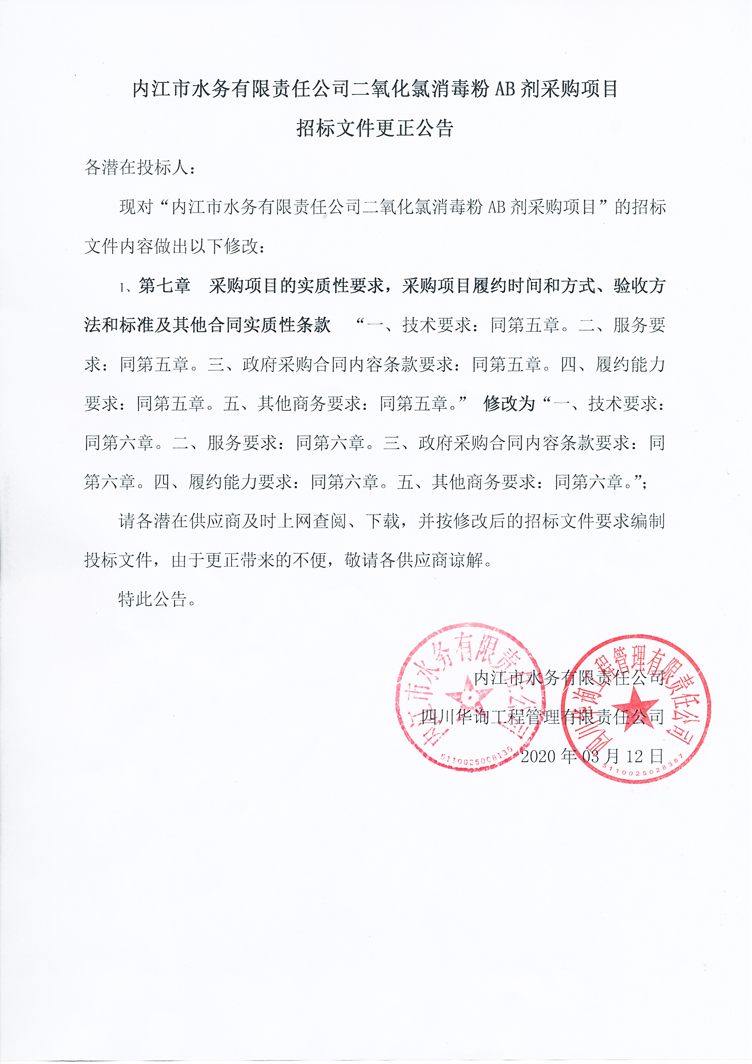 內江市水務有限責任公司二氧化氯消毒粉AB劑采購項目招標文件更正公告
