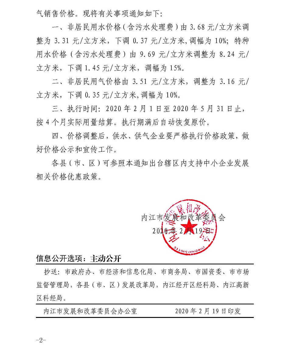 內(nèi)江市發(fā)展和改革委員會(huì)關(guān)于應(yīng)對(duì)新冠肺炎疫情緩解中小企業(yè)生產(chǎn)經(jīng)營(yíng)困難臨時(shí)調(diào)整非居民用水、用氣銷售價(jià)格的通知
