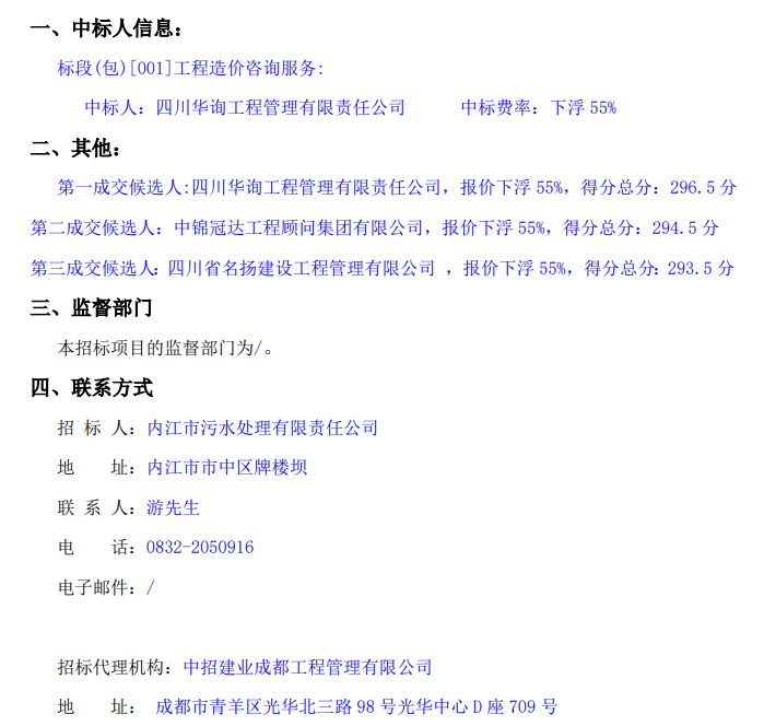 內(nèi)江市第二污水處理廠二期工程造價咨詢服務(wù)項目中標結(jié)果公示