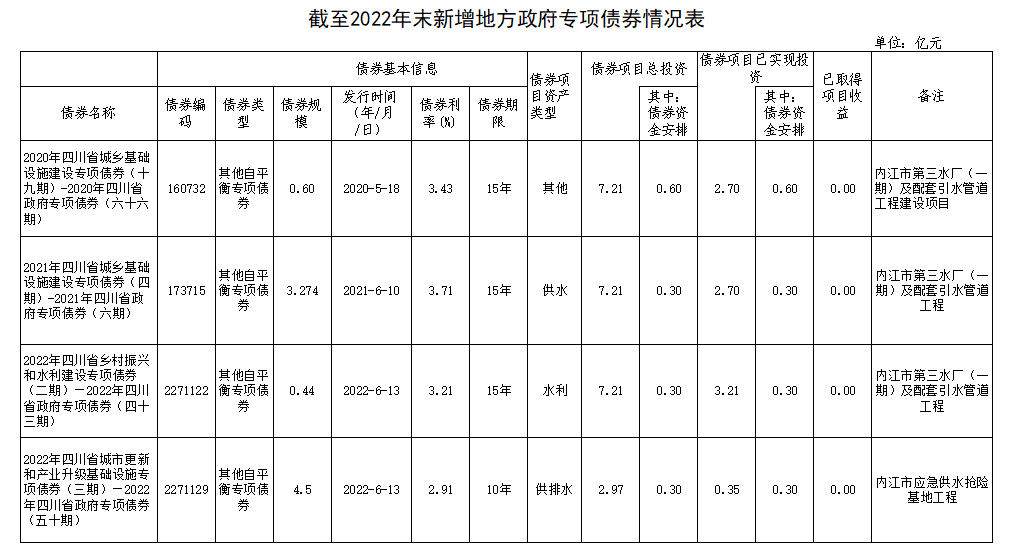 內(nèi)江市本級(jí)截至2022年末新增地方政府債券存續(xù)期信息公開(kāi)(水務(wù))
