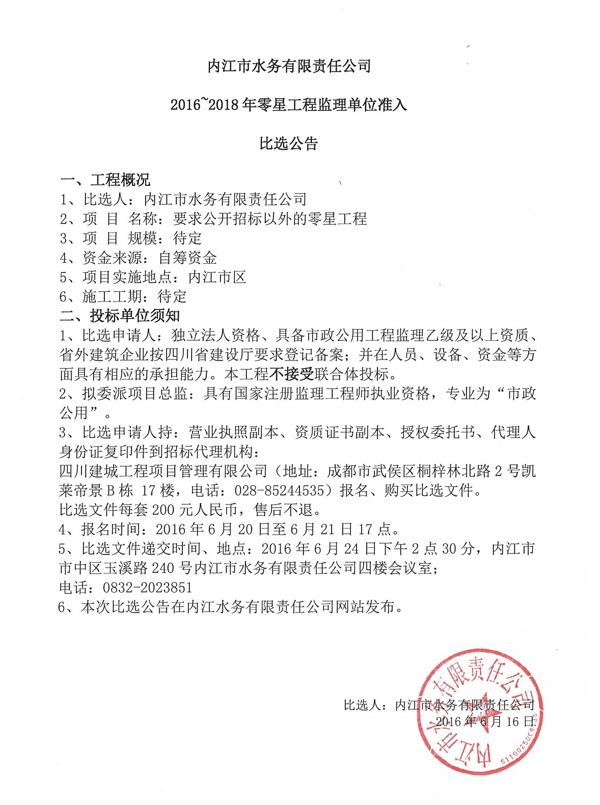 內(nèi)江市水務(wù)有限責(zé)任公司2016~2018年零星工程監(jiān)理單位準(zhǔn)入比選公告
