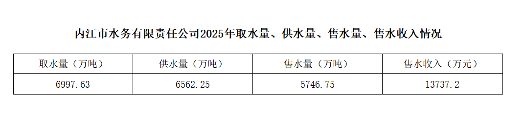 內(nèi)江市水務(wù)有限責(zé)任公司2025年取水量、供水量、售水量、售水收入情況