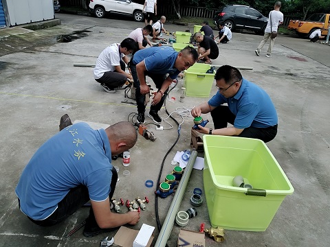 7月20日下午,二水廠維修車間門前,來自市水務(wù)公司管網(wǎng)運(yùn)行部、鄉(xiāng)鎮(zhèn)供水部的11支隊(duì)伍22名技能好手,正在緊張進(jìn)行著搶維修實(shí)操比賽:有的正認(rèn)真識(shí)別設(shè)計(jì)圖;有的正在切割水管,熔合管道;有的已經(jīng)開始組裝管道、閥門......一個(gè)個(gè)全神貫注,顧不上汗水模糊了眼睛,浸濕了衣裳。這是公司開展搶維修技能競(jìng)賽上實(shí)際操作環(huán)節(jié)的一個(gè)場(chǎng)景。