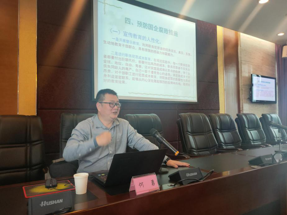 講座上,何勇以“國有企業(yè)預防腐敗實踐探索”為題,從建國以來反腐敗歷史的簡要回顧、當前國企領域反腐敗的形勢、水務企業(yè)違紀違法典型案例、預防國企腐敗措施四個方面,剖析腐敗根源,深入淺出地將國有企業(yè)預腐防變工作做了詳細的梳理和講解,具有很強的教育性和警示性。公司黨委副書記、總經理李濤結合講座內容,對進一步抓好黨風廉政工作提了四點要求:一是要強化政治定力;二是要抓實紀法學習;三是要堅持嚴于律己;四是要自覺接受監(jiān)督。李濤強調,講座的目的在于進一步提高干部職工對黨風廉政建設重要性的認識,切實加強廉潔自律教育,將黨風廉政建設不斷引向深入。